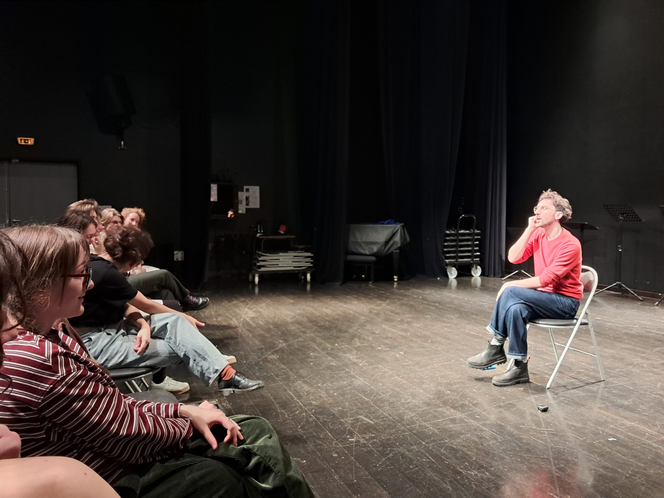 Les étudiants.e.s de khâgne ont suivi un atelier avec Martin Legros de la compagnie La Cohue à partir des textes de Dennis Kelly (ADN). Outre l’immersion dans une méthode de travail appuyée sur les situations, les rapports de force, la recherche de